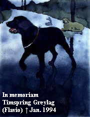 1979 bekam ich Timspring Greylag (Flavio) von ihr, der Int. Champion wurde und noch etliche andere Titel gewann, Zu seiner Zeit war er ein sehr häufig eingesetzter Deckrüde. Flavio hat sogar noch Nachzucht in den USA. Irgendwann  bekam ich selber das Bedüfnis zu züchten. Ich bekam 1984 aus England eine Hündin aus dem Zwinger Lyndhurst.