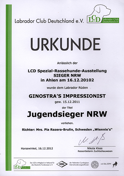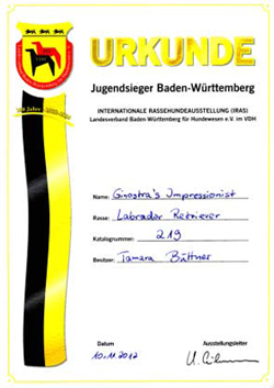 Jugendklasse V1, Best Youngster, bester Rüde, BOB, FCI-Gruppe 8 Platz 3. Jg.CAC (LCD & VDH), Titel: Jugendsieger Baden-Würtemberg.