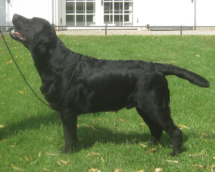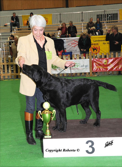 Richterbericht: Quality black, with a beautiful head and kind expression, exc. topline and tailset,nice deep body,exc.bone, lovely character,exc. showboy, will have a great future in the ring.